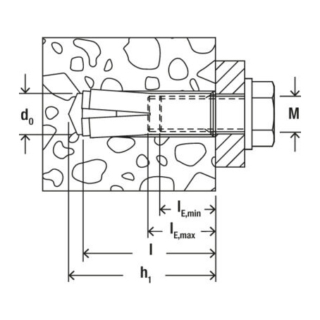 O ponto de fixação em altura de 25 mm evita que a âncora caia do furo antes de ser expandida.