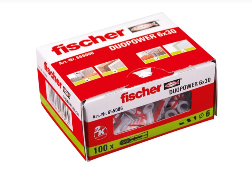 A DuoPower da fischer é uma bucha inteligente de 2 componentes com três princípios de funcionamento. A bucha universal inteligente é ideal para fixações em todos os materiais de construção. Isto permite aplicações muito versáteis com apenas uma bucha. A DuoPower da fischer adapta-se naturalmente ao material e distribui os máximos valores de carga mediante os três princípios funcionais de bloqueio, expansão e torção. Esta resposta perfeita da bucha ao girar do parafuso oferece uma segurança extra adicional. A DuoPower da fischer de 6x50, 8x65 e 10x80 são especialmente apropriados para fixações em materiais perfurados, betão poroso e para trabalhos em gesso-cartonado devido à sua grande profundidade de ancoragem.